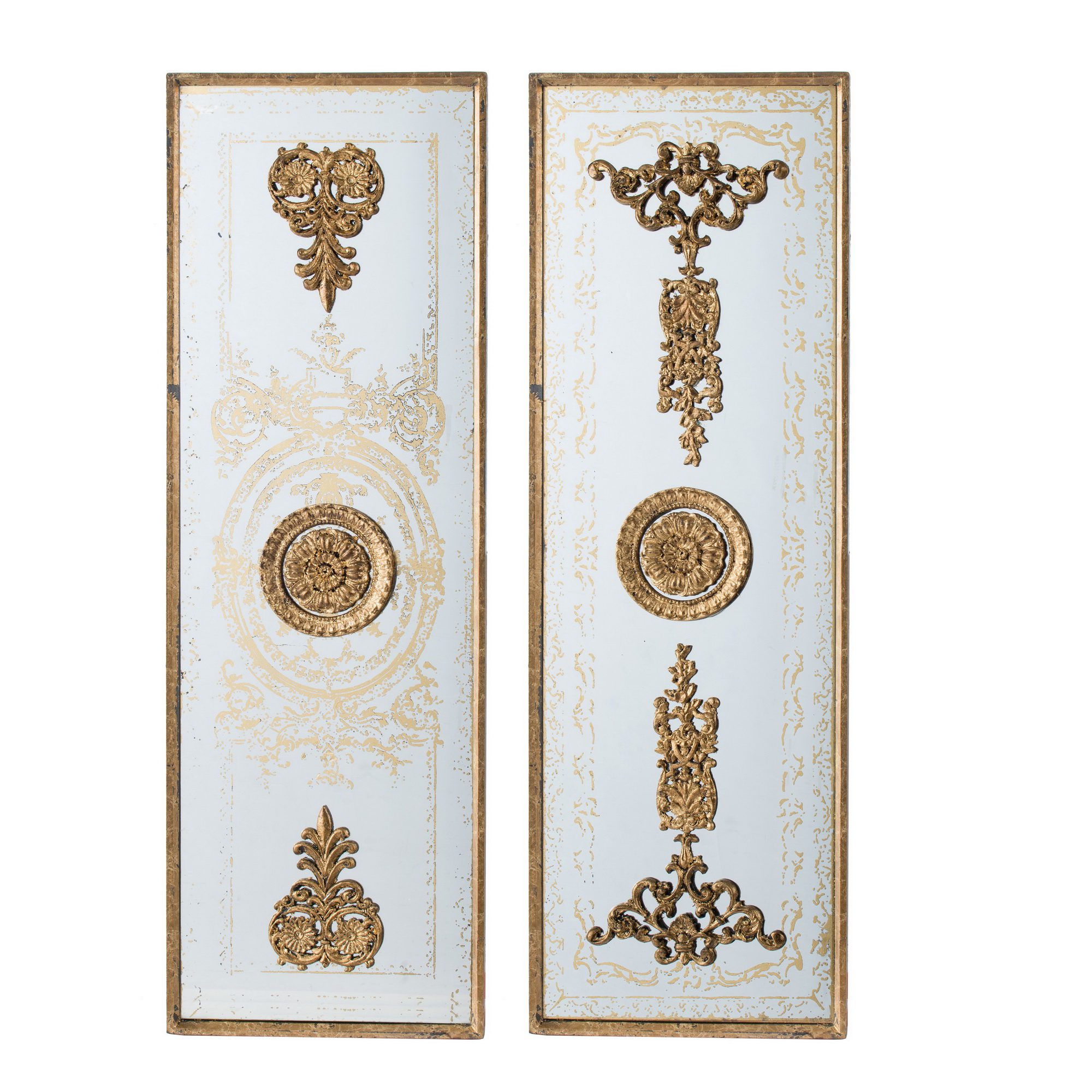 Timeless and regal, this set of two ornate wall panels features intricate gold detailing over a distressed white base. With elegant flourishes, medallion motifs, and a vertically framed shape, these panels add a sophisticated touch to classic or vintage-inspired interiors. Hang them side by side or frame a feature space for maximum impact.