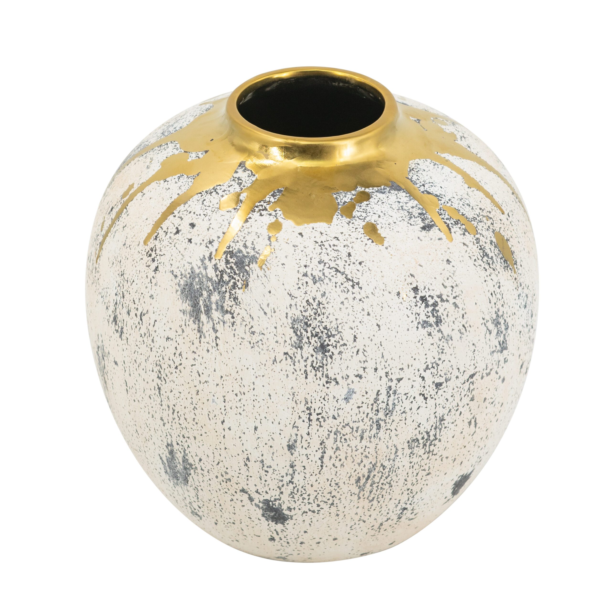 Bold and elegant, this round ceramic vase features a distressed white texture with a radiant gold drip design around the opening. Its symmetrical shape and luxurious detailing make it a perfect statement piece for contemporary or glam interiors.